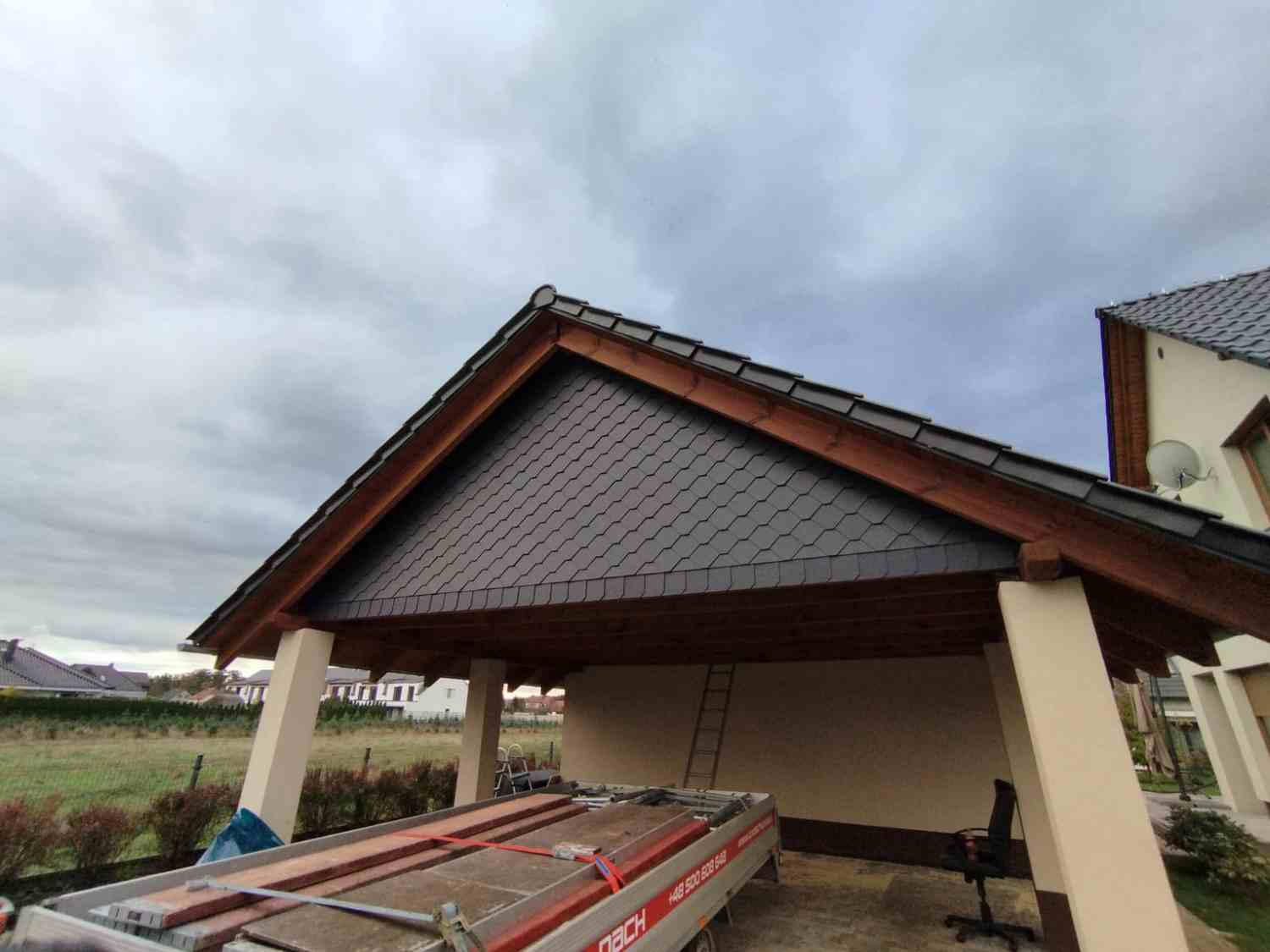 - Stworzyliśmy strych poprzez wykorzystanie przestrzeni pomiędzy jętkami a kalenicą na wiacie samochodowej. Całość szczytu została obita łupkiem (zdjęcie nr 2)