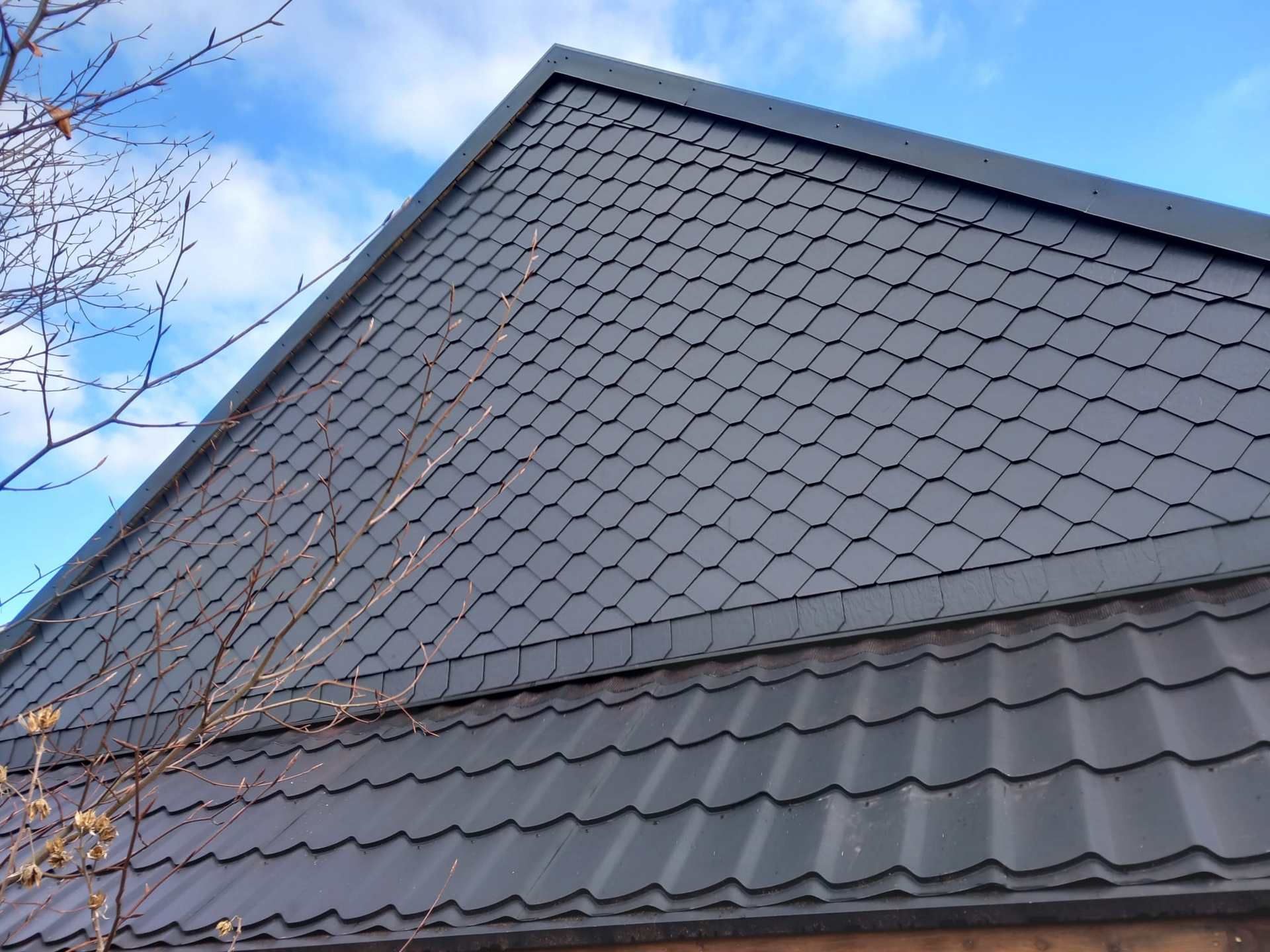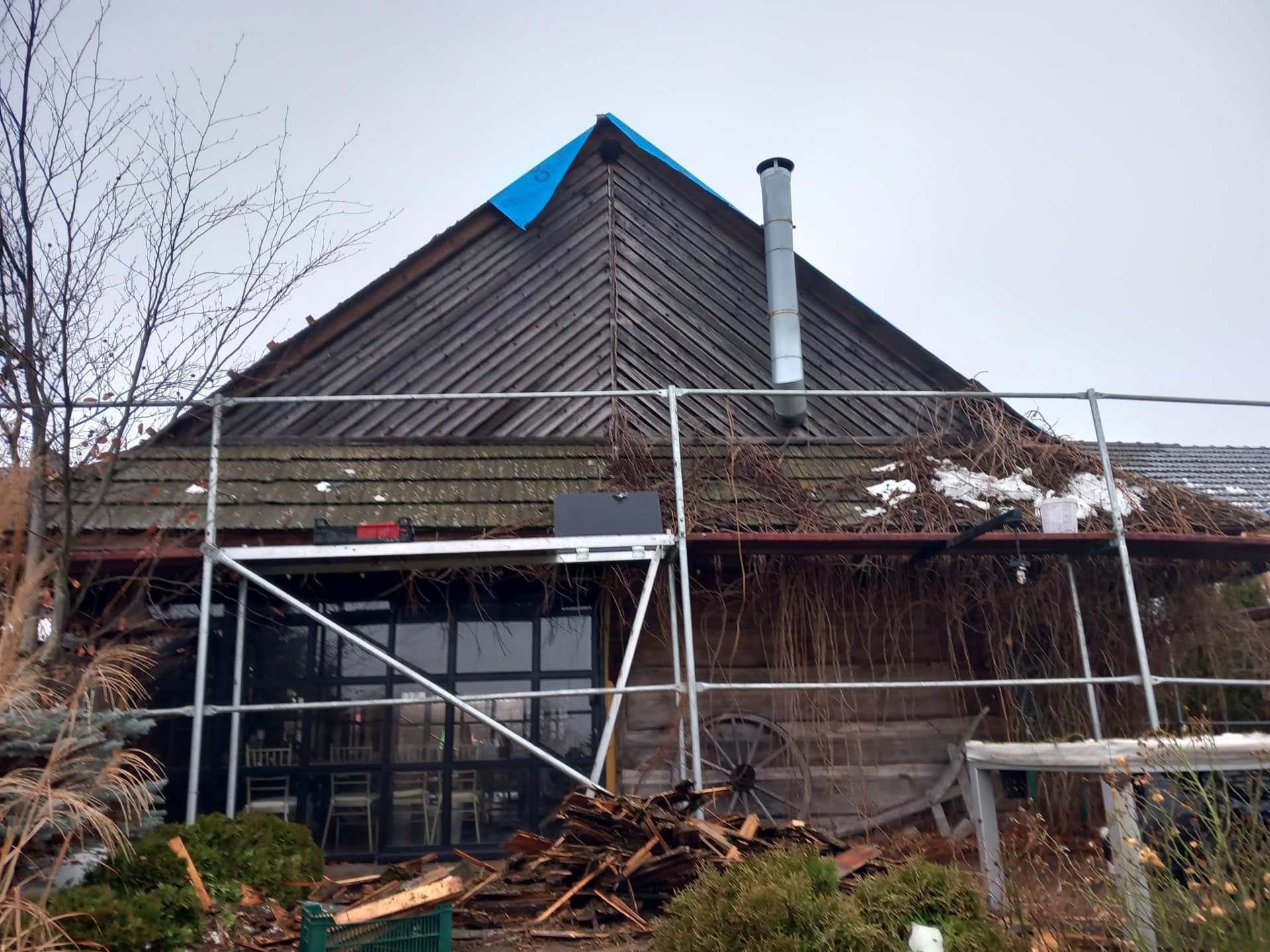 Podczas naszych prac zamieniliśmy ściany szczytowe, z drewnianych na łupek, co daje nam bardziej długotrwały efekt, nie wymagający cyklicznej impregnacji.